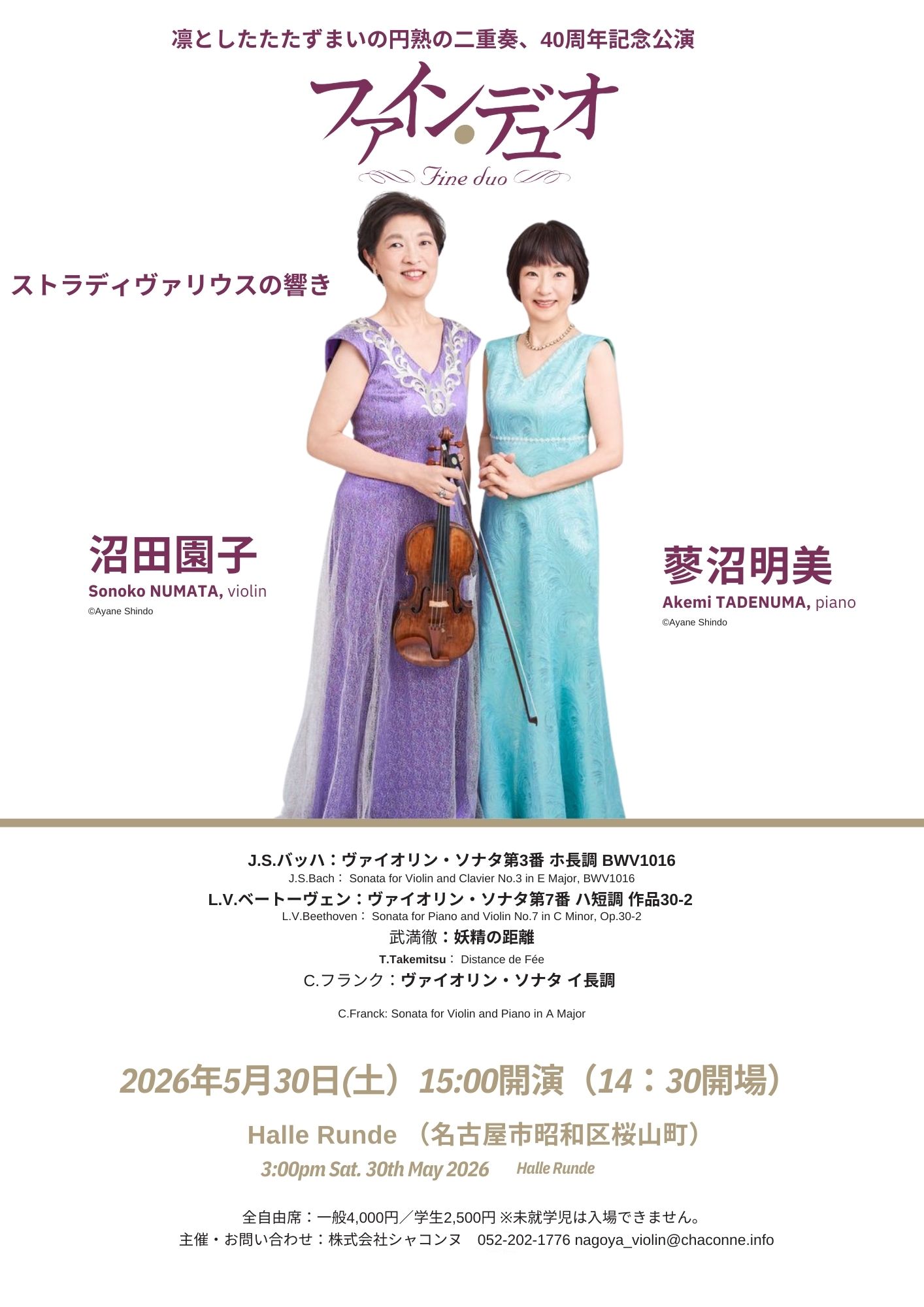 ファイン・デュオ結成40周年とシャコンヌ創業50周年を記念しコンサートを開催させていただきます。 ストラディヴァリウスの響き、ぜひ会場でお楽しみください。 2026年5月30日(土)15:00開演(14:30開場) Halle Runde (名古屋市昭和区桜山町) 全席自由 一般4,000円/学生2,500円 チケットご購入・その他ご質問はシャコンヌ名古屋店(TEL 052-202-1776)までお問い合わせください。