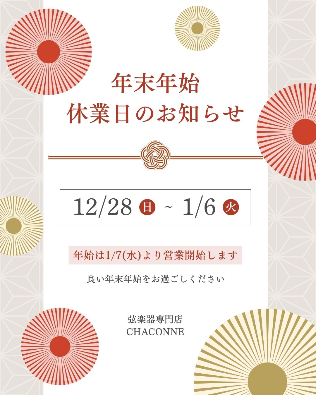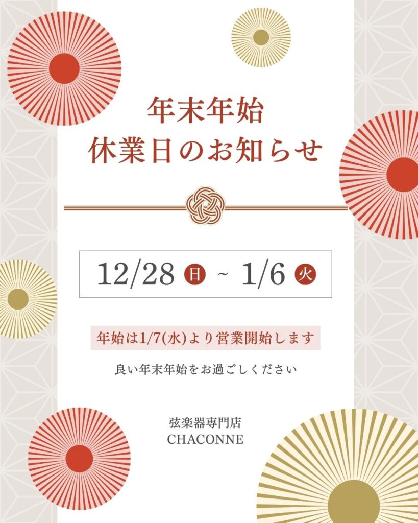 12月28日(日)から1月6日(火)まで、シャコンヌ全店冬期休業になります。